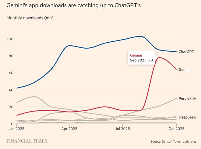 第一,Gemini App的下载量正逐步上升并追赶ChatGPT。全球知名移动应用数据分析公司Sensor Tower的最新数据显示,9月Gemini App的月活跃用户数达到7.8亿,较5月的2亿月活跃用户增长了290%,10月Gemini App的月活跃用户数为6.5亿,较5月增长了225%。