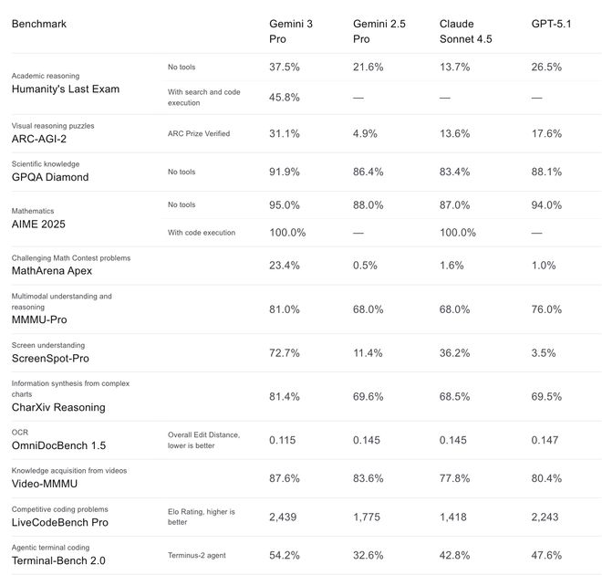 在模型上,谷歌今年先后推出了推理模型Gemini 3、图像生成和编辑模型Nano Banana Pro等。在学术推理、数学和视觉推理等关键基准测试中,基于谷歌自研TPU训练的Gemini 3表现均优于GPT-5模型。